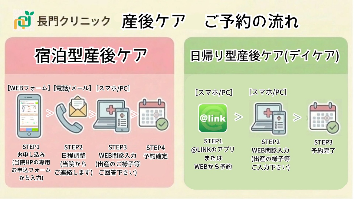 ※WEB問診の回答終了時点で予約完了となります。問診内容によっては、当院での産後ケアのご利用ができないことがあります。出産時や現在の状況について当院助産師がお電話でお伺いすることがありますので、ご了承ください。